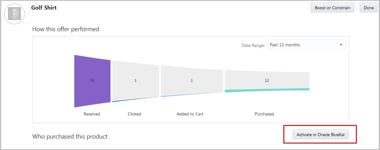 If you use Oracle BlueKai, you can activate individual products to send data to BlueKai about consumers who responded to product offers. After you configure rules for adaptive intelligence, your campaigns will include consumer data for the activated products.