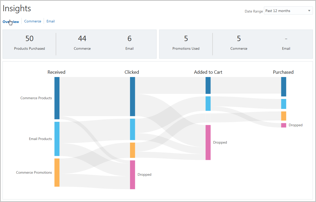 The Insights page now features a new and improved way of monitoring consumer behavior, tracking recommendations separately from multiple channels. The Overview tab showing the flow of consumer responses from different channels, such as commerce widgets and marketing emails, in a single Sankey diagram. Use the diagram to view the performance of recommendations sent to consumers within a specified data range.