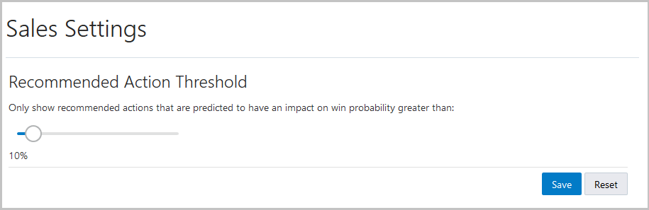 For example, you’ve set the threshold to 30%. Suppose a recommended action has an impact of 30 percent or more on the opportunity win probability. In this scenario, the recommendation is shown to salespeople because the impact is more than the threshold you’ve set. Salespeople can then focus on only those actions that are predicted to have a significant impact on the opportunity win rate.