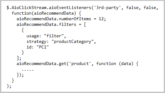The following code snippet shows an example of adding a filter that will recommend only products that are in the product category PC1.