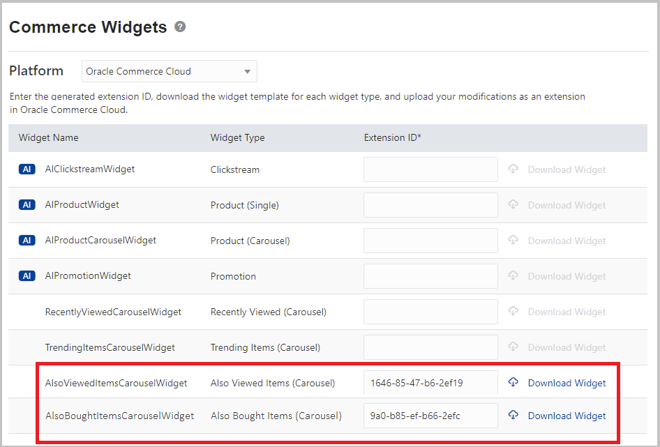 To create Also Viewed or Also Bought widgets, refer to the topics in the Key Resources section. These new widgets don't impact any others that you may have created using templates in Oracle Adaptive Intelligent Apps for CX. You don't need to make any changes to existing widgets.