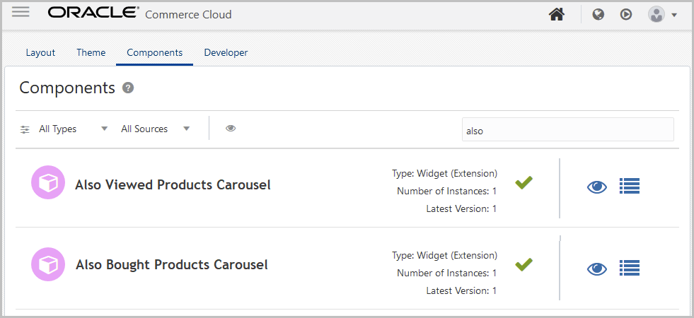 This screenshot shows the components uploaded to Oracle Commerce Cloud.