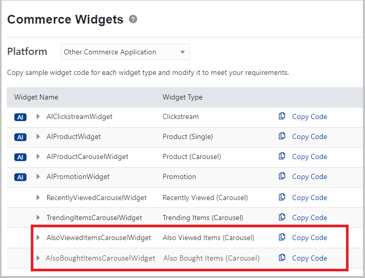 To create an Also Bought or Also Viewed widget for a third-party commerce application, copy the code and use the sample snippets as desired. This screenshot shows the new widgets to copy.
