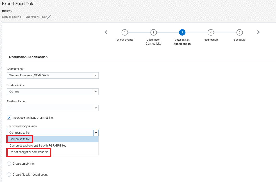 This screenshot shows the Export Feed Data page and highlights the encryption and compression options you can select.