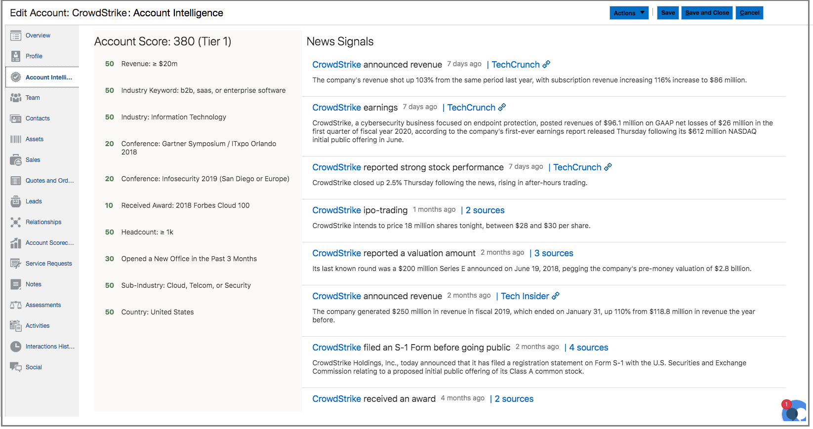 Monitor news on prospects with smart talking points in Oracle Engagement Cloud. Use news signals to have relevant business discussions and identify potential opportunities. Use account scores to understand if accounts are a good fit for your business, based on how closely they match your ideal customer profile.