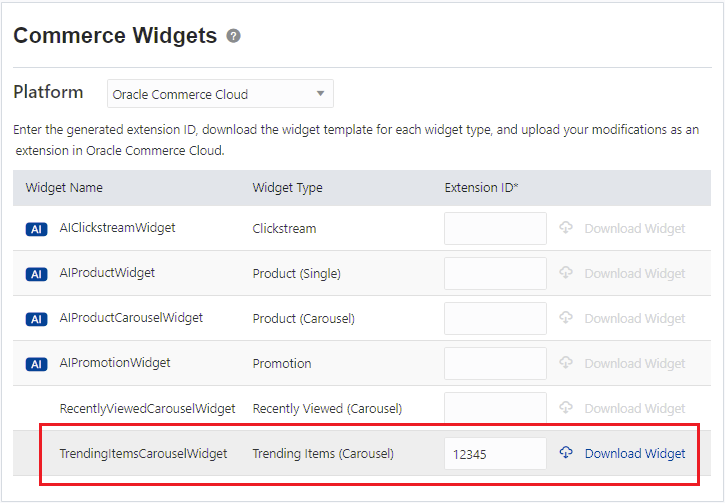 The following screen capture shows the Trending Items widget templates to download for Oracle Commerce Cloud.