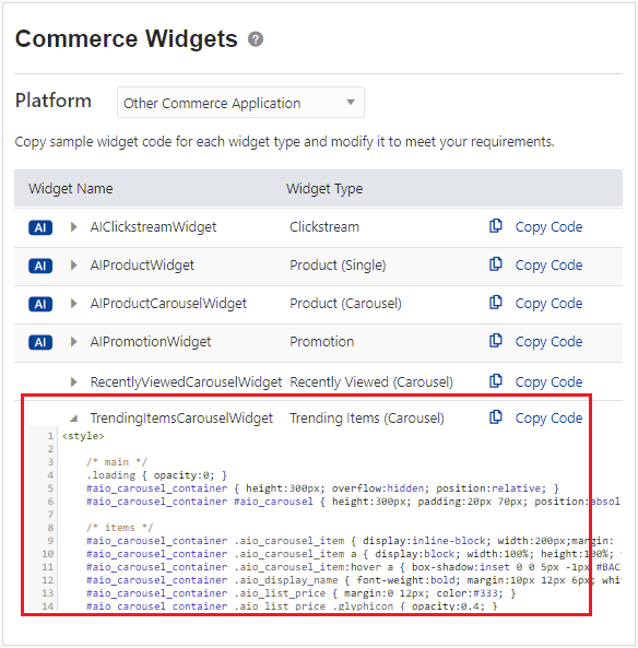 To create a trending items widget for a third-party commerce application, copy the code and use the sample snippets as desired. The following screen capture shows the trending items widget code to copy for other commerce applications.