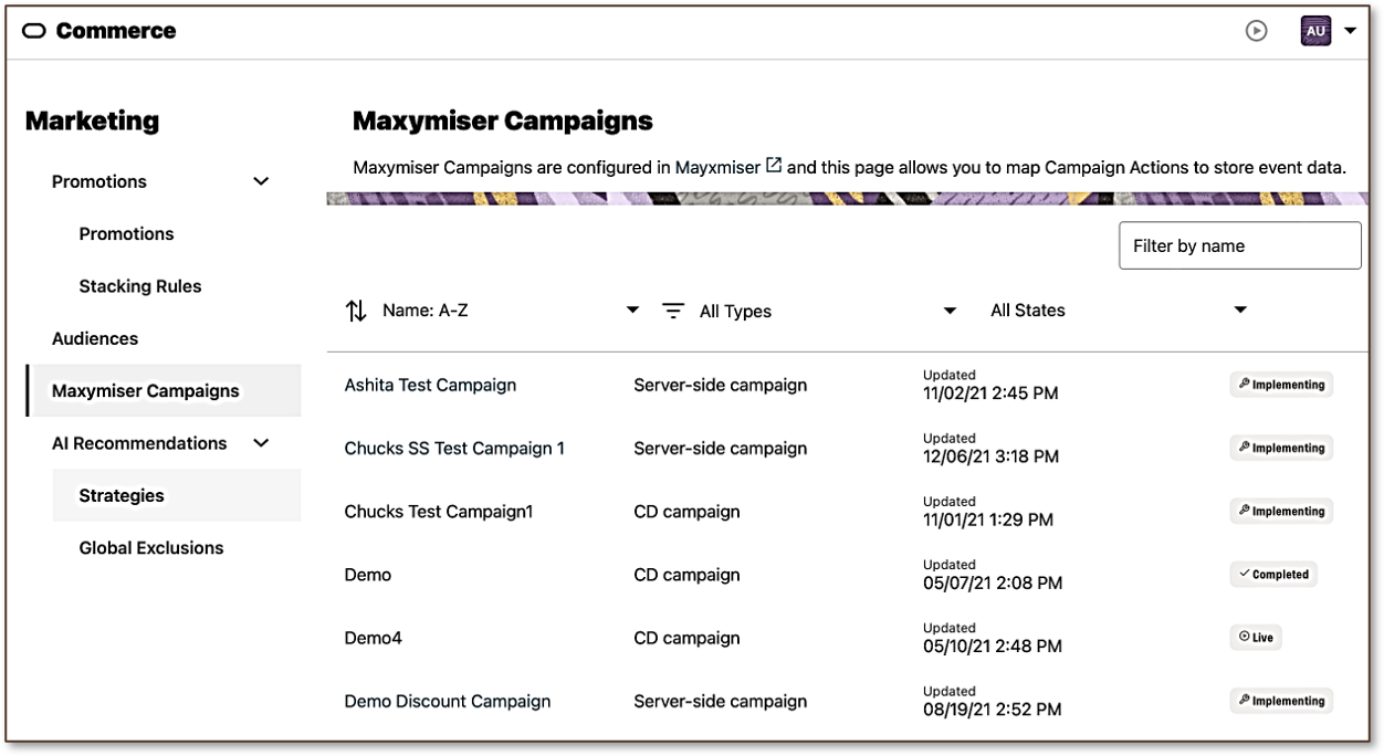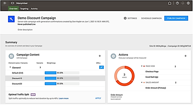 Oracle Commerce merchants can now use Oracle Maxymiser to define and execute A/B tests on their Commerce site. With this Commerce integration, merchants can test different customer experiences side-by-side to determine how they affect visitor behavior.