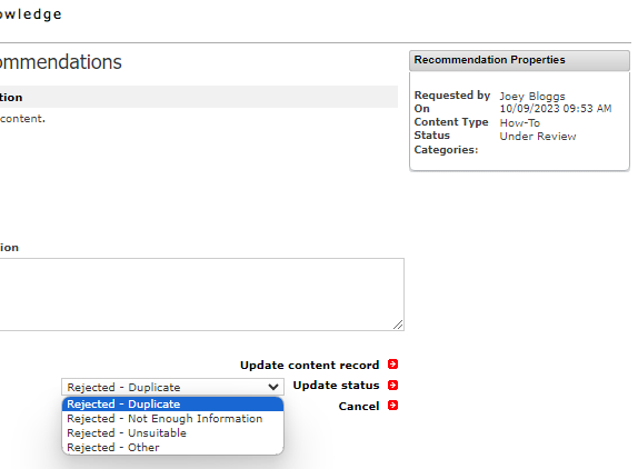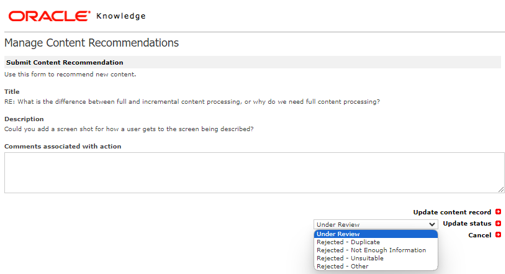 Authors working on recommendations can mark a recommendation as being "Under Review" in addition to the previously available update and reject statuses. This let's the user who left the recommendation know that you are working on their recommendation but have not yet rejected or accepted it. This status will display anywhere a user can see the recommendation. Once an article is in "Under Review" status, it will disappear from the list of available statuses to assign to the recommendation because you cannot go from Under Review to Under Review.
