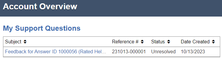Once your user submits their feedback in the overlay they will be able to check on the status of that feedback in Account Overview under My Support Questions. Additionally, as with any Incident, your users will be able to post new messages including attachments, making it possible to have a dialog about the feedback.