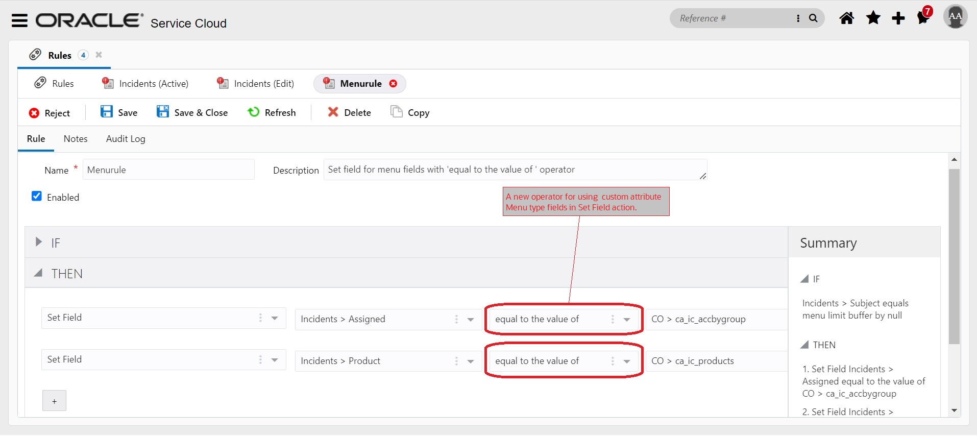 - Supports the 'equal to the value of' operator for menu type fields in the Set Field Action of THEN Clause.