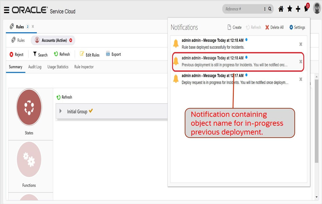 The notification about in progress deployment will appear in scenarios such as when the rule base being deployed is very large or the agent logs off and logins in the middle of a deployment or a session timeout etc...