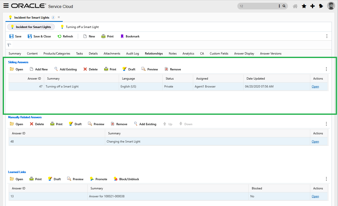 The Sibling Answers feature allows the user to connect answers that have similar products, categories and file attachments.