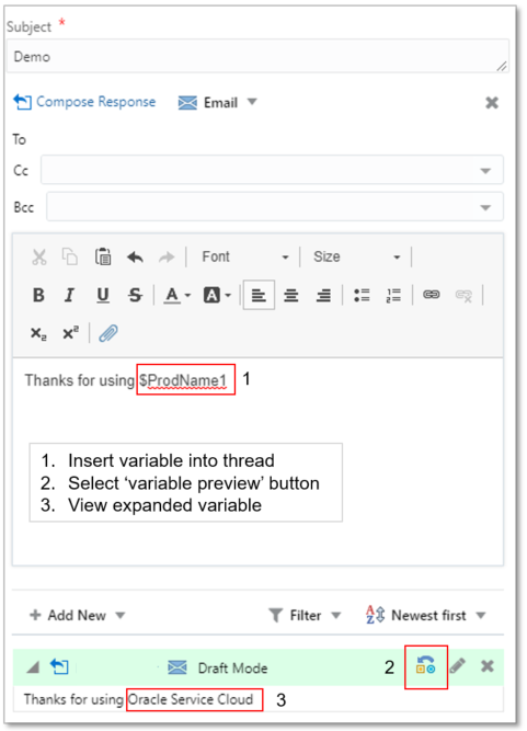 When composing a thread entry, a preview icon will appear. Selecting the icon will expand any variables in thread and replace them with the corresponding variable content. Selecting the icon once again will return the content to it's variable form.