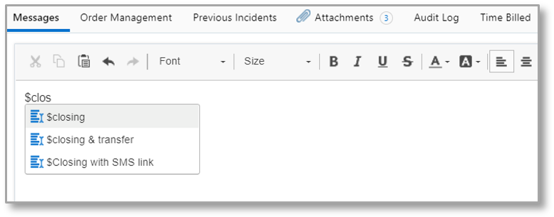 Typing a '$' character into an incident thread will trigger a standard text search by title based on the characters following '$'. The search results will appear in a contextual menu and will be filtered by typing additional characters. Users can insert standard text by using the tab and enter keys or the mouse to select the desired standard text from the inline search results.