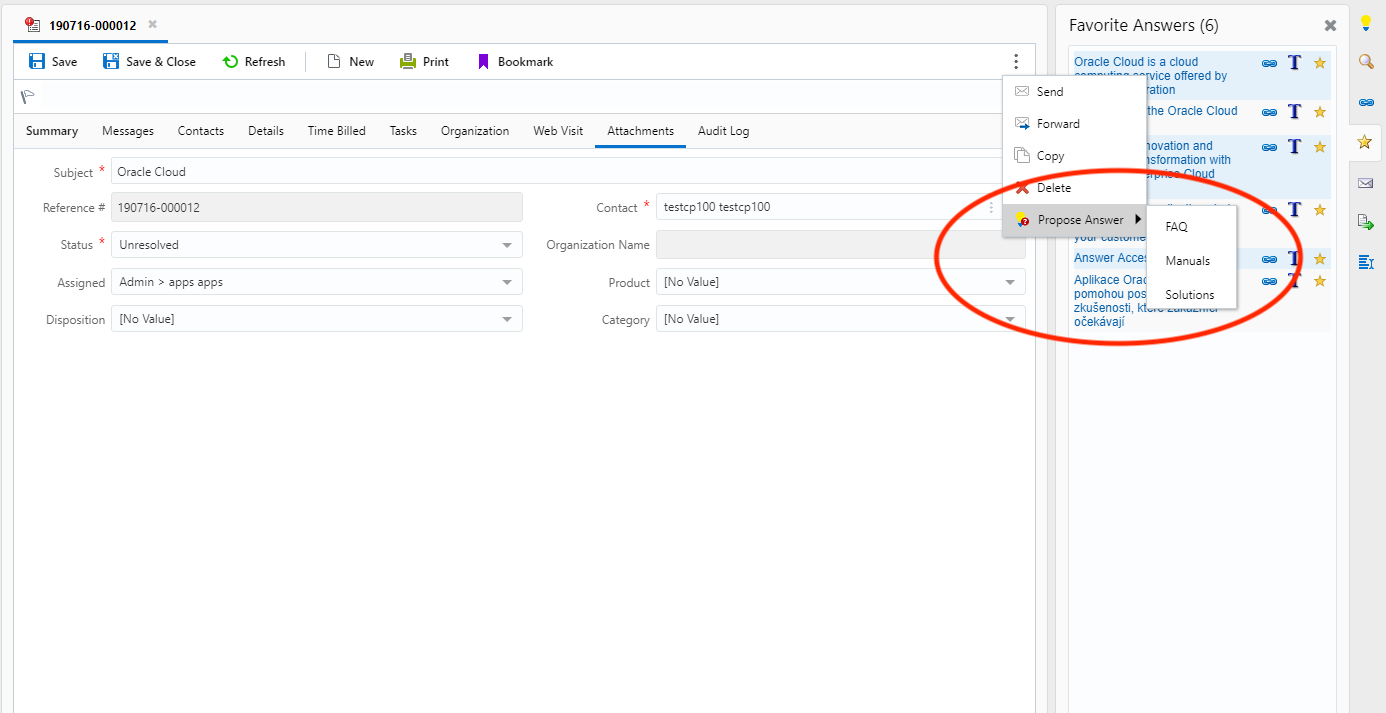 The feature allows an agent to propose an incident as an answer from the incident workspace. Sometime a customer’s question is common enough that an agent might believe that other customers should also have access to the answer. If an agent believes that the information belongs in the knowledge base (Oracle Knowledge), they can propose the incident as a potential answer.