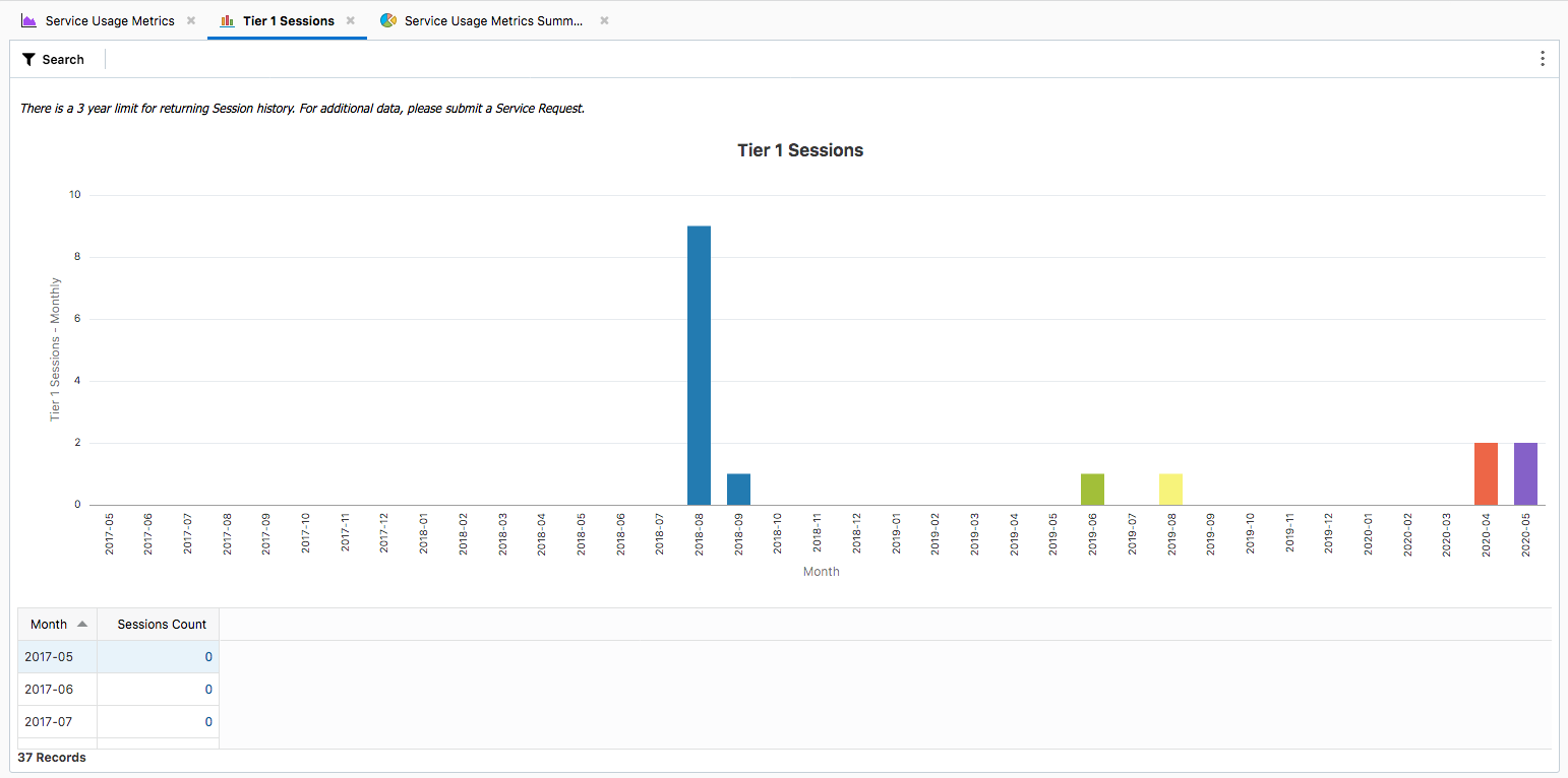 There is a three year limit on historical Session data. For additional data, you may submit a Service Request to the Technical Support team.