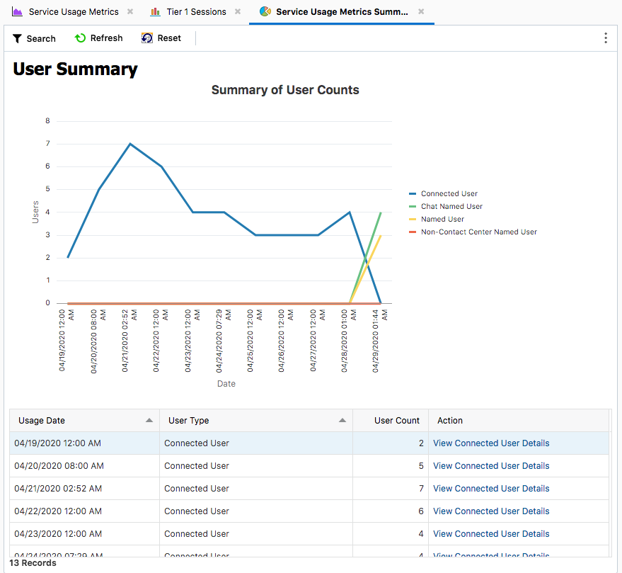 Service Usage Metrics will allow access to see the monthly and daily breakdown of Tier 1, 2, and 3 Sessions or daily peak Seat data for Connected, Named, Chat or Non-Contact Center seats.