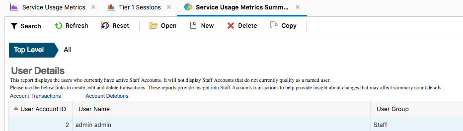 Users can drill into the Action column to see supporting details for the supporting Accounts. The Accounts listed will be the accounts that are currently configured in the system. Currently, there is not a daily snapshot of users that comprise the daily peak. To help understand recent Account object changes, there are reports to help see Account Transactions and Deletions within the User Details report.