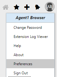 - After logging into the Agent Browser UI, select the 'settings and actions' menu from the user icon in the upper right-hand corner of the application.