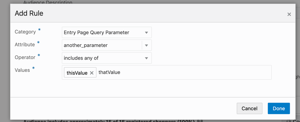 In addition to being able to build audiences of shoppers based on UTM query parameters, merchants can now build audiences of shoppers based on other custom query parameters that are included as part of a shopper's visit URL (current session only).
