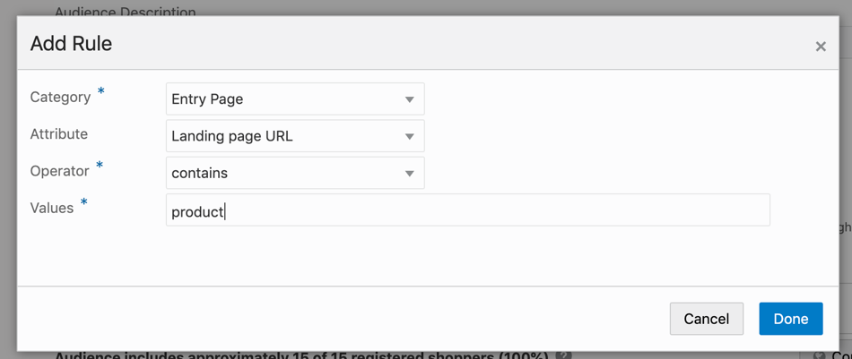 String matching can be used to select a range of landing pages to apply an audience rule against. For example, this can be used to present a personalized experience to shoppers landing on a particular set of landing pages on the site (e.g. landing page URL contains "holiday").