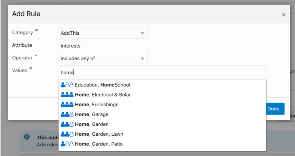NOTE: Due to GDPR, AddThis is not operational in Europe, so audience rules that evaluate AddThis interests will behave as though European visitors have no interests.