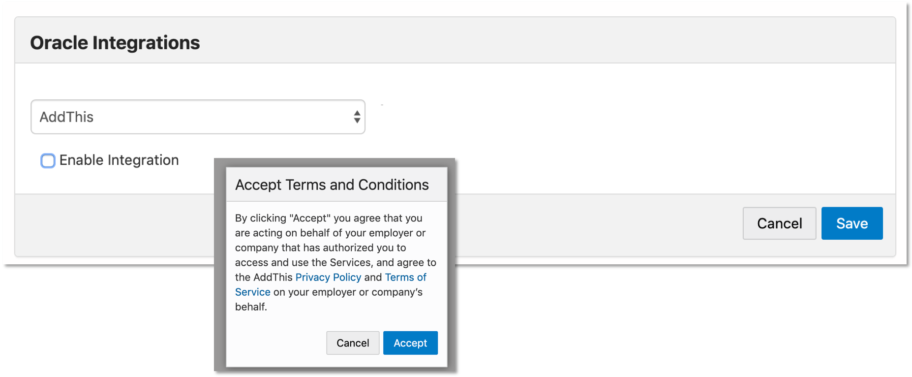 To enable the integration, go to the OCC Admin UI under Settings > Oracle Integrations and opt into the AddThis cooperative agreement.