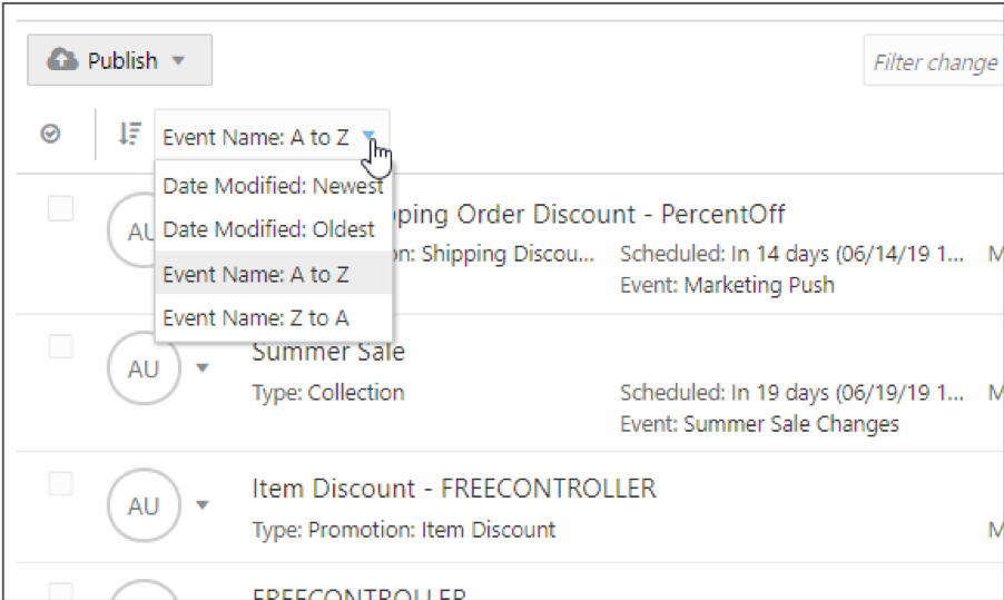 We've made two publishing-related UI improvements. First, we've made it easier to find items to publish in the change list. You can now Sort by Publishing Event.