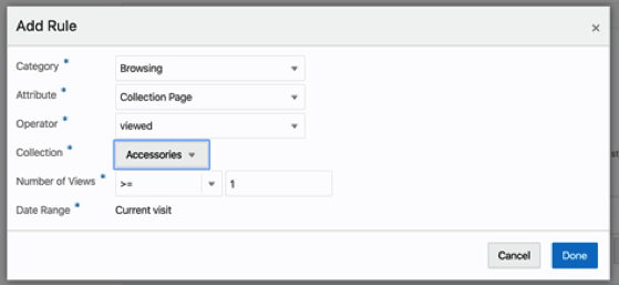 NOTE: We currently do not support the ability to filter by a specific catalog, search on dynamic properties of a collection, search across subtypes (e.g. product type = tables), or create nested rules.