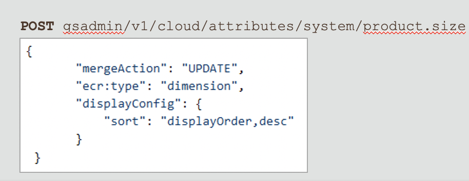 - Specify in /gsadmin/v1/cloud/attributes/system/<facet-name> the new sort configuration, for example "sort": "displayOrder,desc;displayName,asc“ - to define that the facet is ordered by display order, and any undefined values are ordered alphabetically.