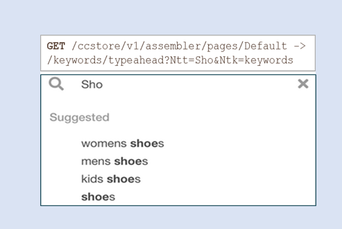 - Once an index is run (this can be manually invoked by calling POST /ccadmin/v1/search/index { “op”: “baseline” }), suggestions can be returned by calling: GET /ccstore/v1/assembler/pages/Default/keywords/typeahead?Ntk=keywords&Ntt=<characters>