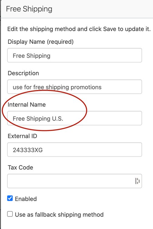 - Internal names are automatically displayed in the Shipping Method editor in Shipping Discount promotions editor.