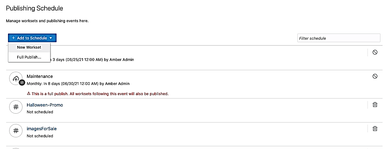 - You can still publish all active changes by scheduling a Full Publish on the publishing schedule. This will publish all changes in all worksets.