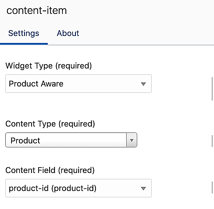 - Add the content item widget to your product detail page template and select the content type and content field you want to use for product ID to link the relevant content to the product page.