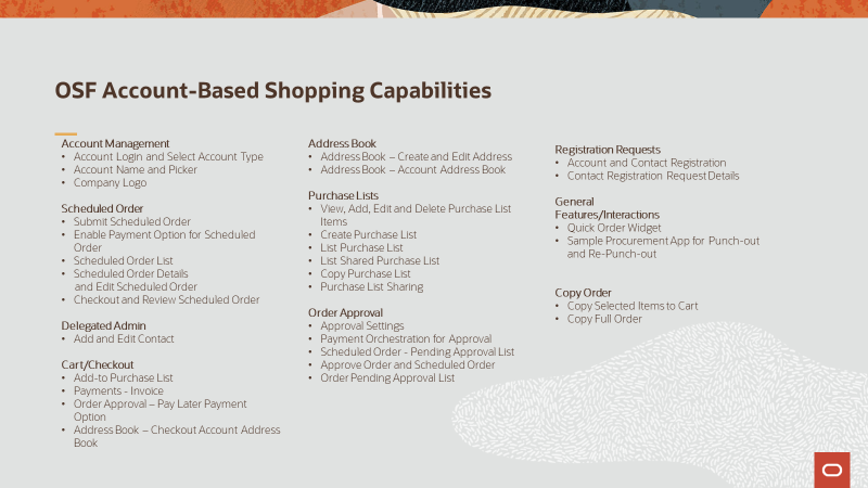 With this release, Oracle Commerce’s machine learning-driven recommendations engine now uses account-wide relationships to drive recommendations to buyers. The behavior of all contacts within a B2B account is considered. While recommendations continue to be generated for an individual buyer, the system also factors in key information on other buyers within the same account.