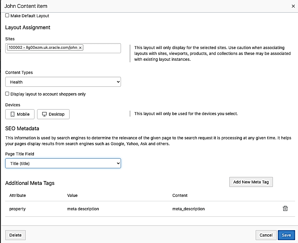 - Business user can map Oracle Content Management fields to common SEO meta tags and add additional ones into the headers from the content layout.