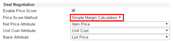 When Enable Price Score is selected for Transaction Line Integer-type attributes, administrators can select the existing Commerce attributes to be used for Net Price, Unit Cost, and Basis Attributes in Simple Margin Calculations.