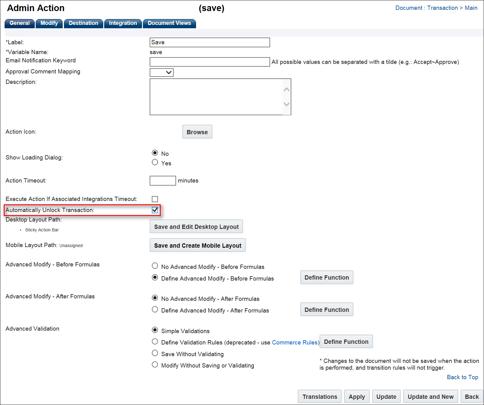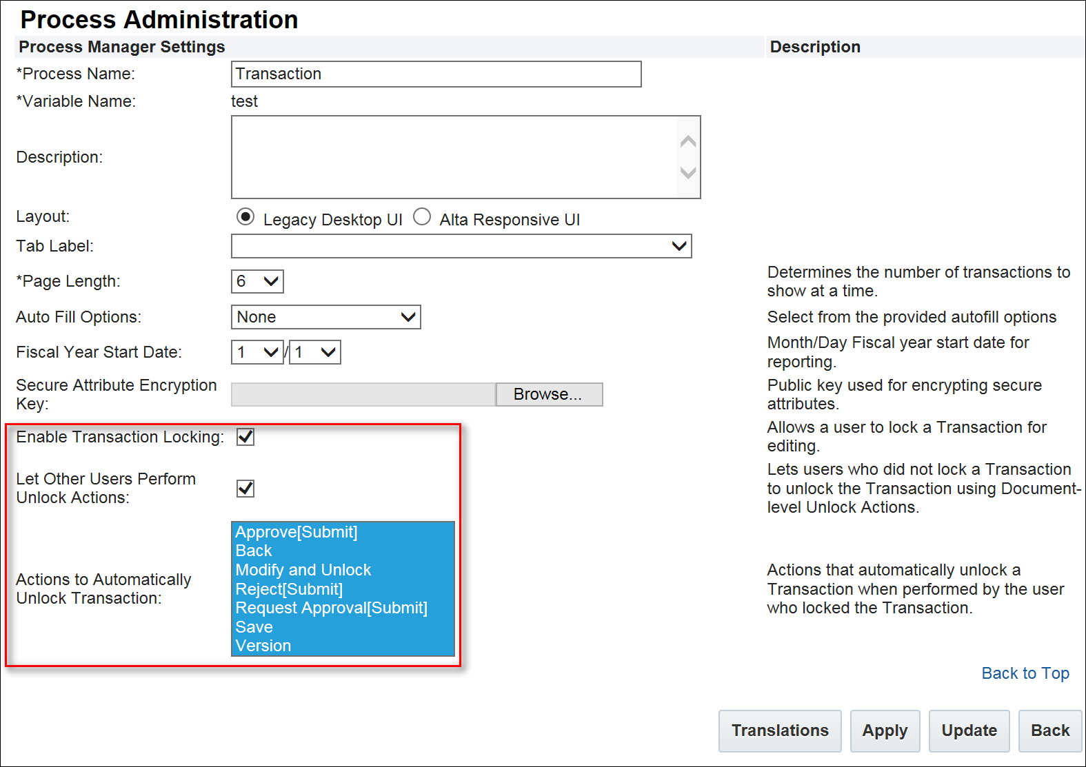 - When the Enable Transaction Locking checkbox is not marked, administrators can still view, update, or delete Unlock type actions. End-users cannot execute the actions unless an administrator enables the Transaction locking feature.