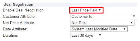 When Deal Negotiation is enabled for currency-type Commerce attributes, the Last Price Paid option can be selected. Administrators can set the following options to specify Last Price Paid criteria: Customer Attribute, Net Price Attribute, Date Attribute, and Duration.