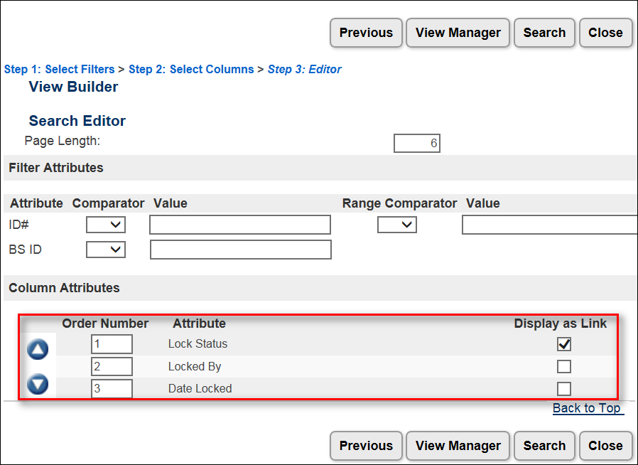 When users opt to mark the Lock Status, Locked By, and Date Locked checkboxes to include these special attributes as search result columns, they can specify the order in which to display the columns in the search results.