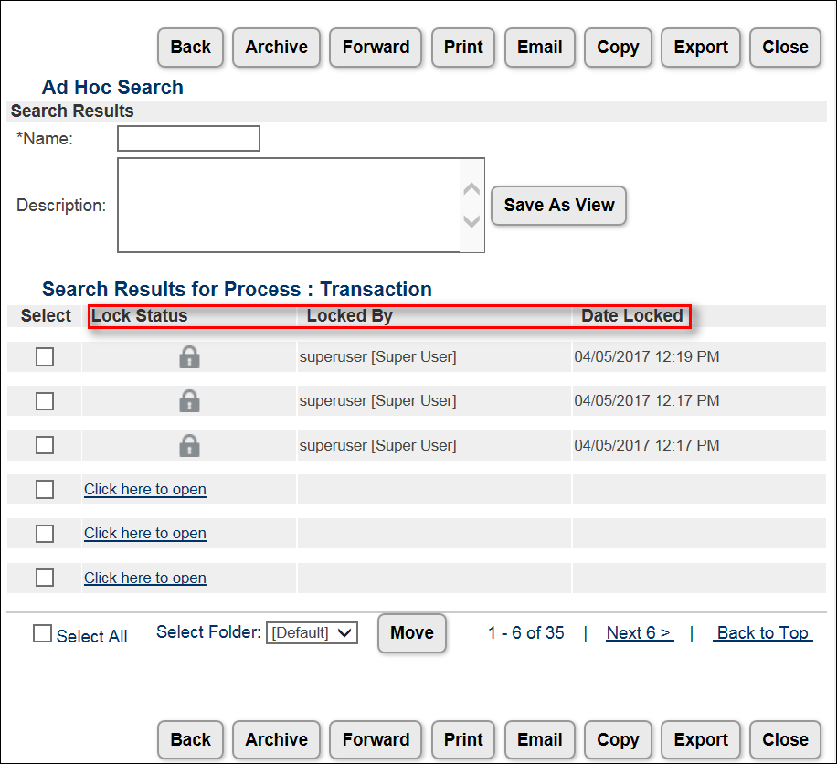 The following is an example of the Lock Status, Locked By, and Date Locked special attributes displayed as columns in the search results.