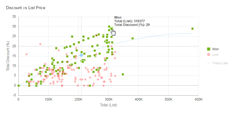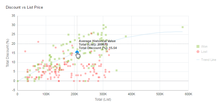 In the following image, Total List Price and Total Discount Percentage are shown for a "Won" data point. List Price and Discount information will also be displayed when hovering over a "Lost" data point.