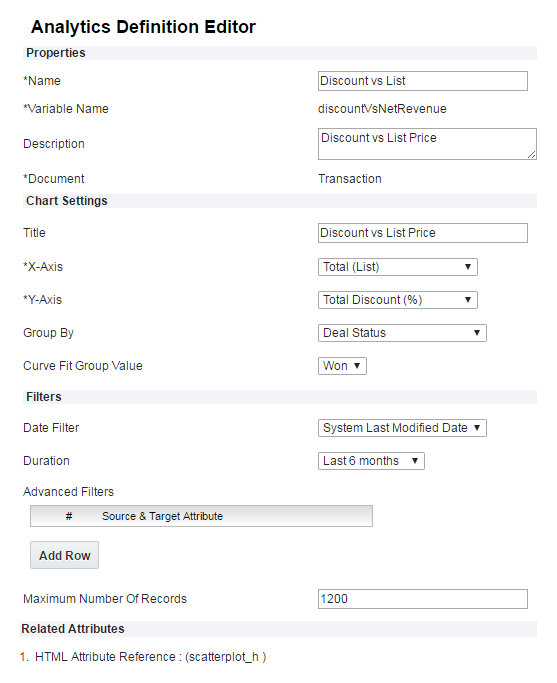 The Deal Comparison Analytic is a graph that displays data points as a comparison set in a scatterplot chart. In 2017 R1, CPQ provides a user interface that allows administrators to define analytics by selecting from business-friendly options. Deal Comparison scatterplot analytics can be defined to display the historical relationship between any two numeric Commerce attributes (currency, float, or integer). Once defined, Deal Comparison Analytics can be displayed in Commerce Transaction and Transaction Line UIs by associating the analytic with an HTML Commerce attribute. Deal Comparison Analytics can then be exposed to users by adding this HTML attribute to Desktop and Mobile UIs just like any other commerce attribute.
