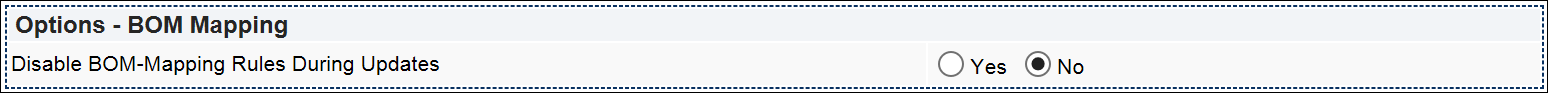- When administrators select the Yes option, BOM Mapping Rule items do not display in configuration. The functionality remains the same as in prior releases. When users save a BOM Mapping Rule to a Transaction, they can view the BOM Mapping Rule items in Commerce line items.
