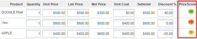 The Price Score metric indicates relative profitability, with values ranging from one to nine. "1" indicates the worst or lowest profitability, and "9" indicates the best or highest profitability. In addition, the Price Score numbers are highlighted with different colors to provide a quick visual indication of profitability for Transactions and Transaction Lines. Prices Scores from one through three are highlighted in red, four through six are highlighted in yellow, and seven through nine are highlighted in green.