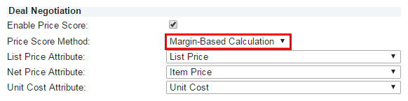 Deal Negotiation provides three calculation methods for price scoring using existing Commerce attributes. For each method, any numeric attribute may be selected for use as a variable in the calculation. The Margin-based calculation uses the current price margin and the List Price margin to determine the relative profitability. The List-Based calculation is derived from net and list price and can be used if cost data is not available in CPQ. The Simple Margin calculation divides the profit margin by an admin-defined "Basis" attribute.