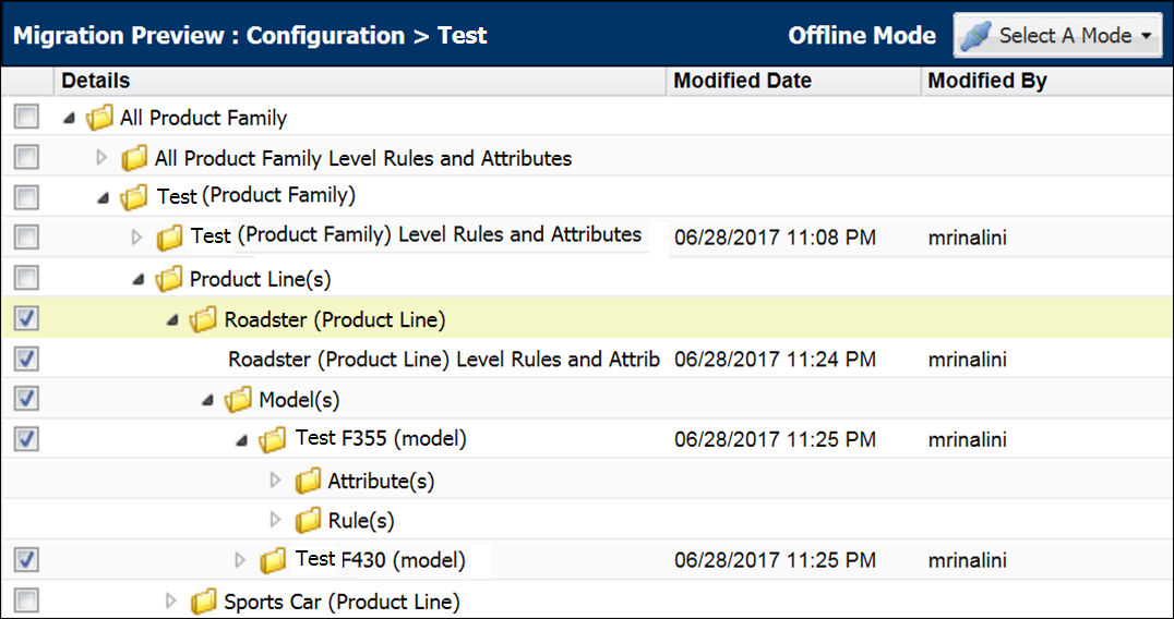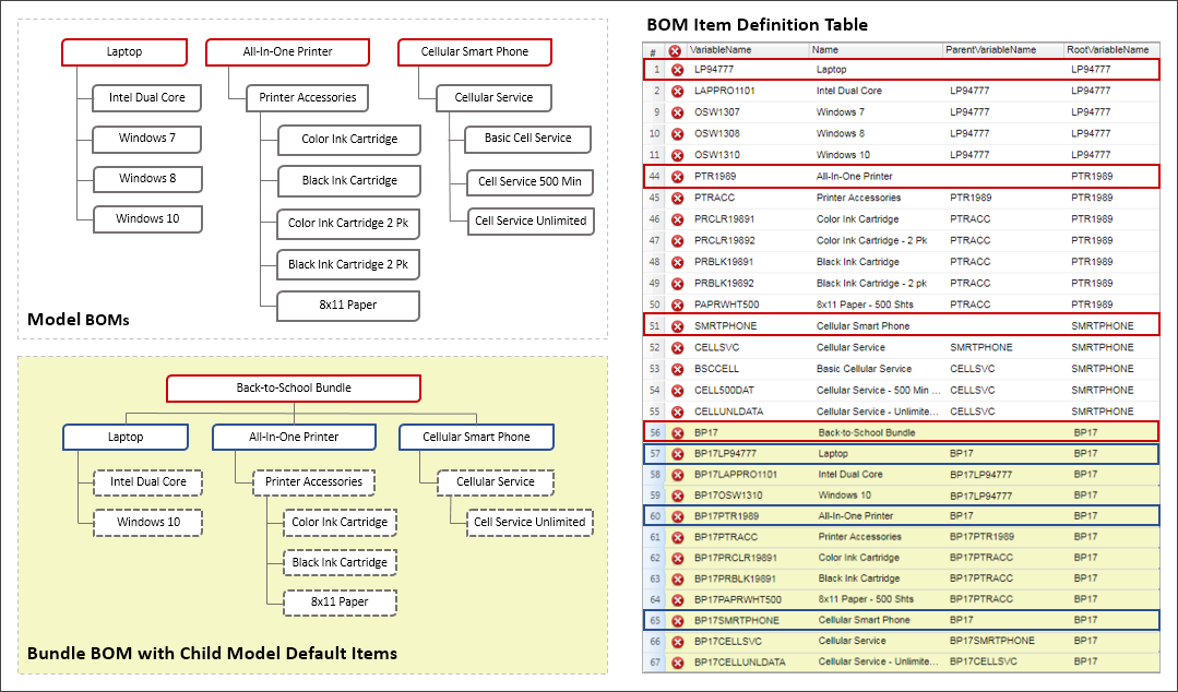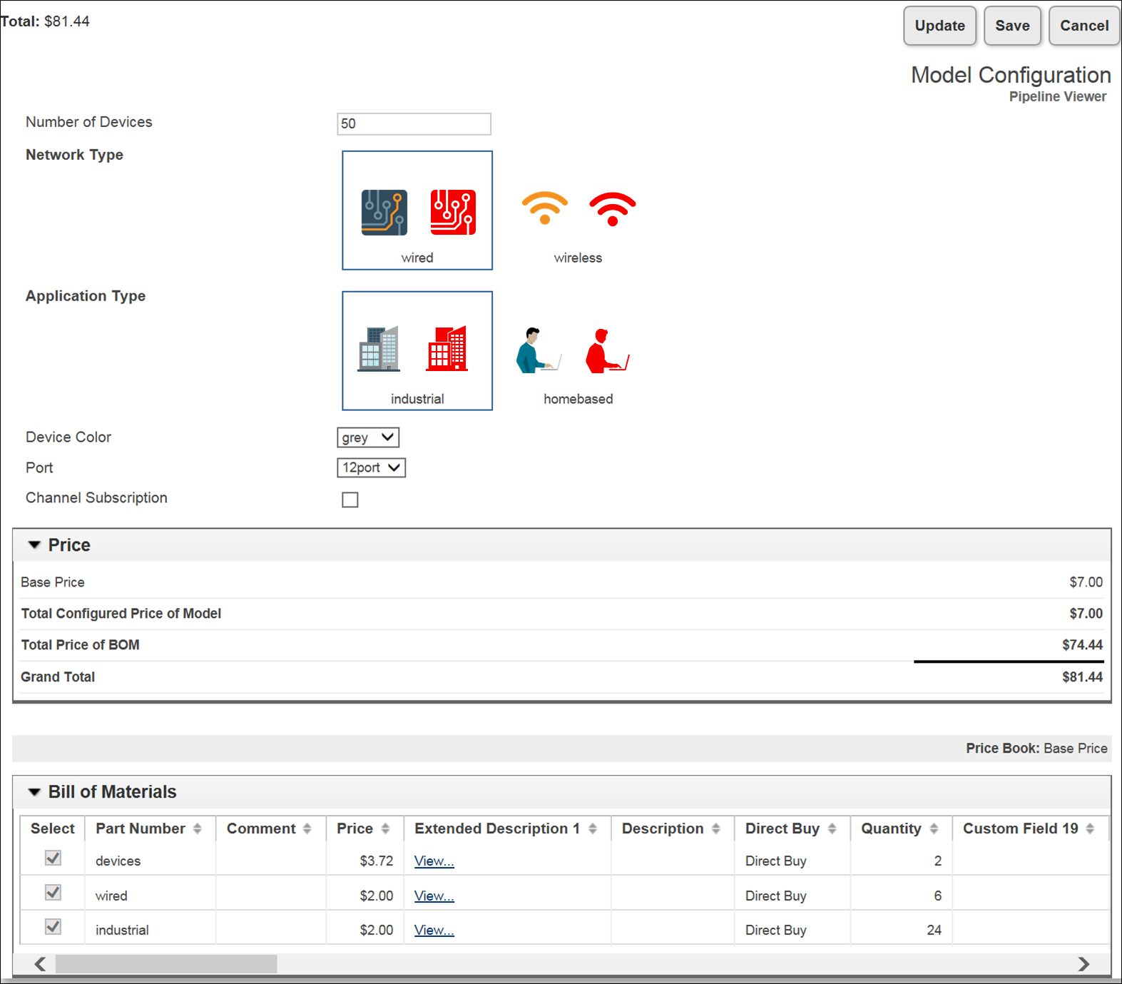 View the hierarchical relationship between models and parts in the line item grid through the display of different icons for models and parts. |