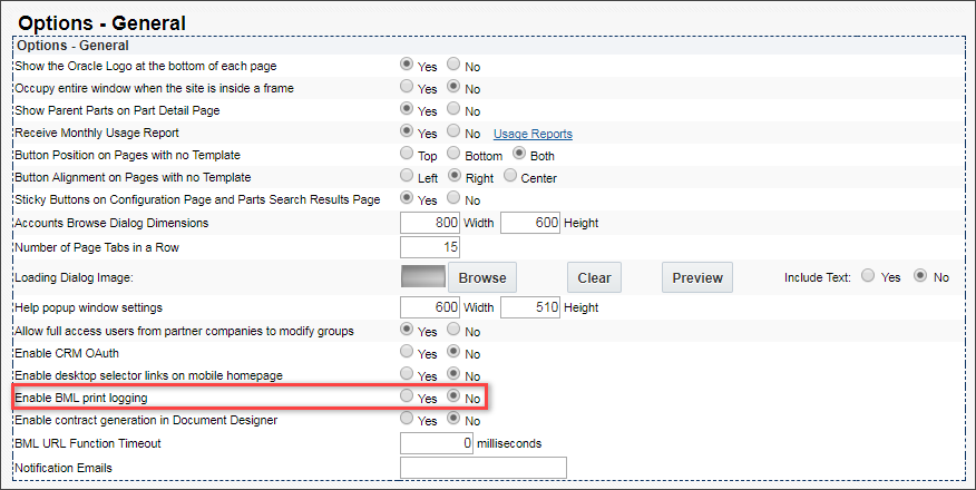 Navigate to Admin > General Site Options to access BML Print Logging options. The following options are available for Enable BML print logging: