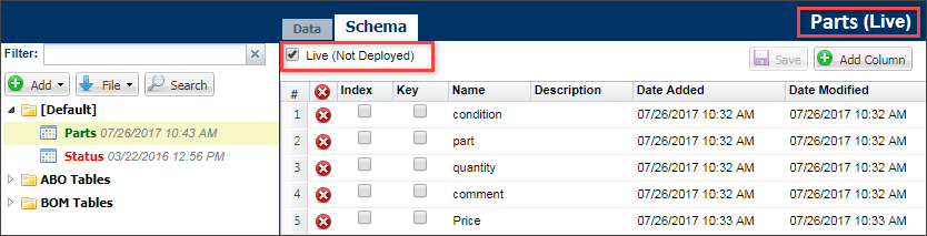 Administrator can access the "Live" option on the Schema tab for data tables. The following image shows "Live" enabled for the "Parts" Data Table.